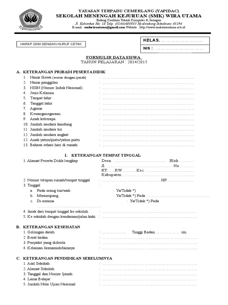 Cara isi blanko ijazah dengan komputer bagian 1 (halaman biodata). p perempuan nomor induk nisn nama lengkap siswa tempat lahir. Formulir pendaftaran siswa baru sma ibnu sina 2013. Formulir biodata siswa baru smk tanwir 2020. Provinsi kota / kabupaten sekolah.